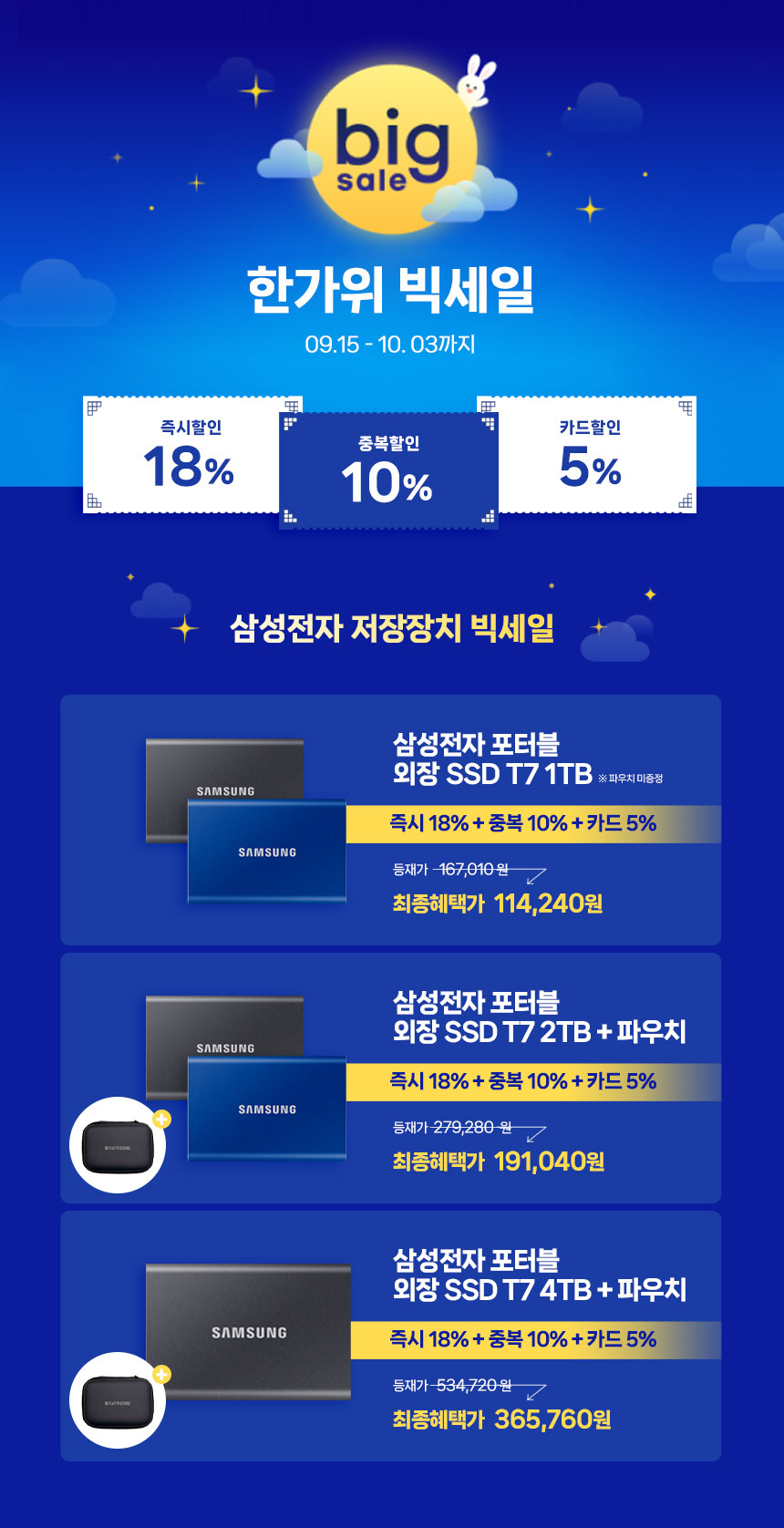 지마켓 옥션 한가위 빅세일! 삼성 외장 SSD T7 33% 할인 혜택! ( 9/15 - 10/03 )