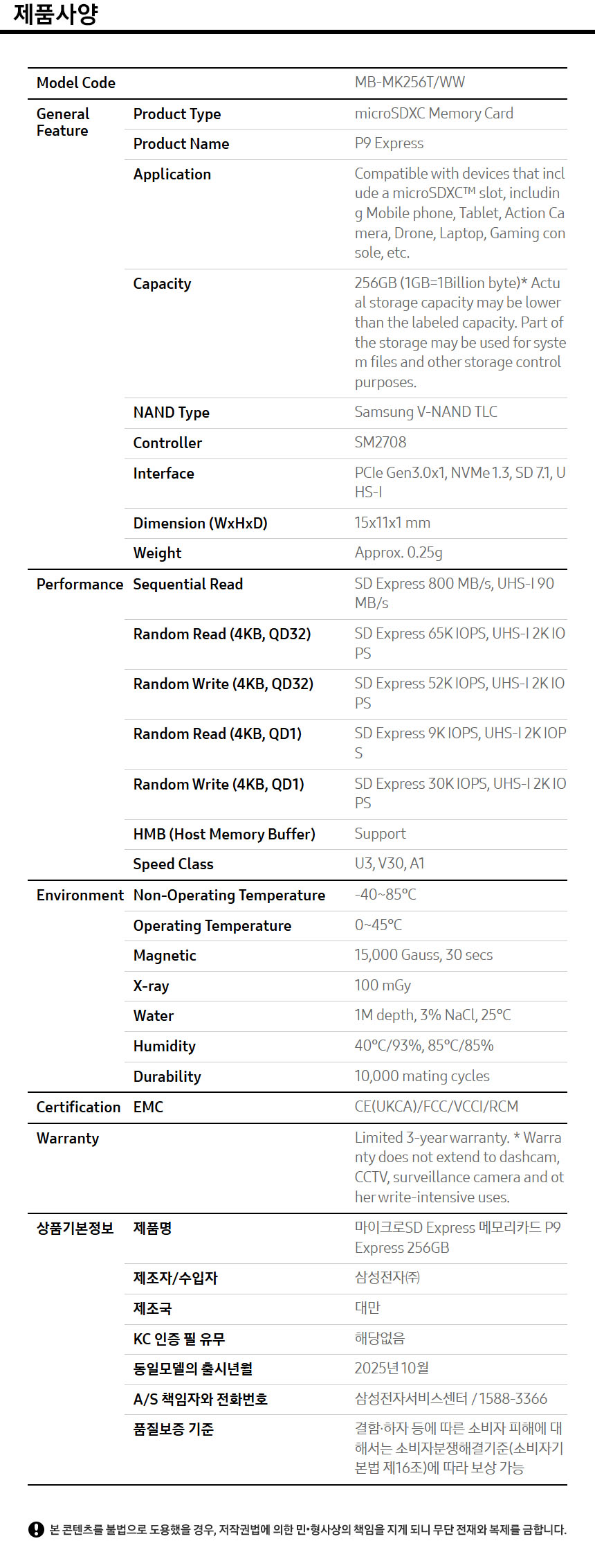 삼성전자 마이크로SD 익스프레스 카드 P9 Express 256GB